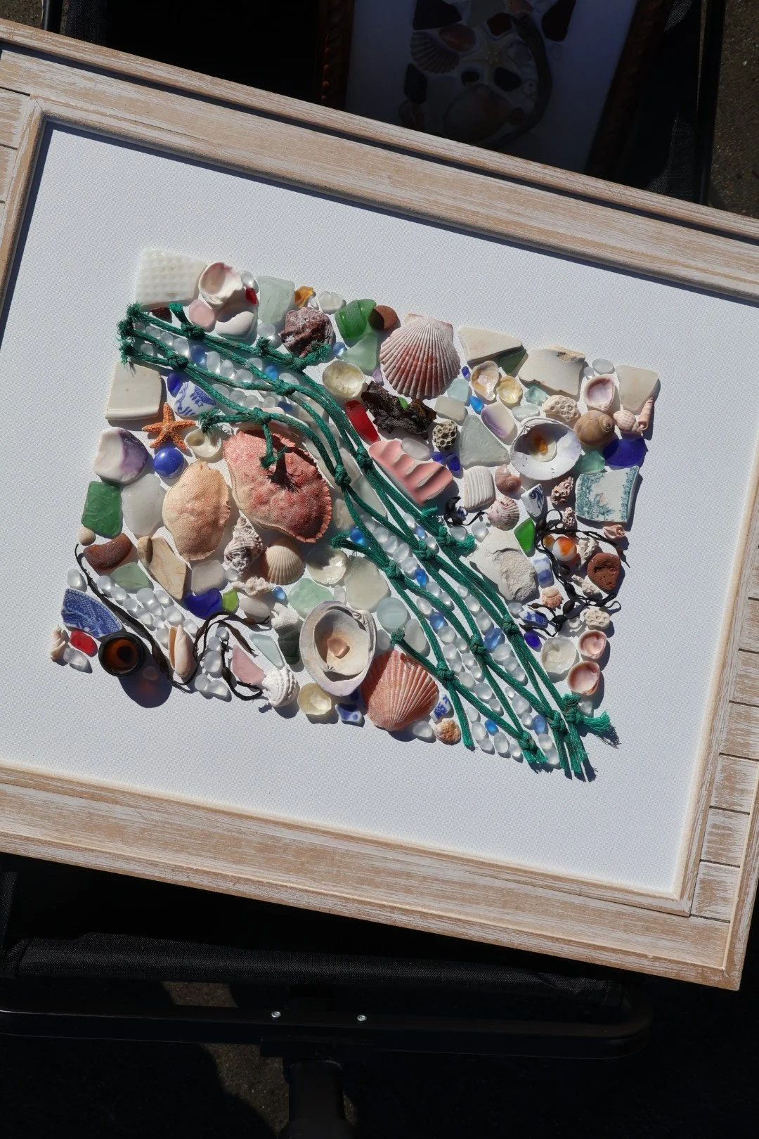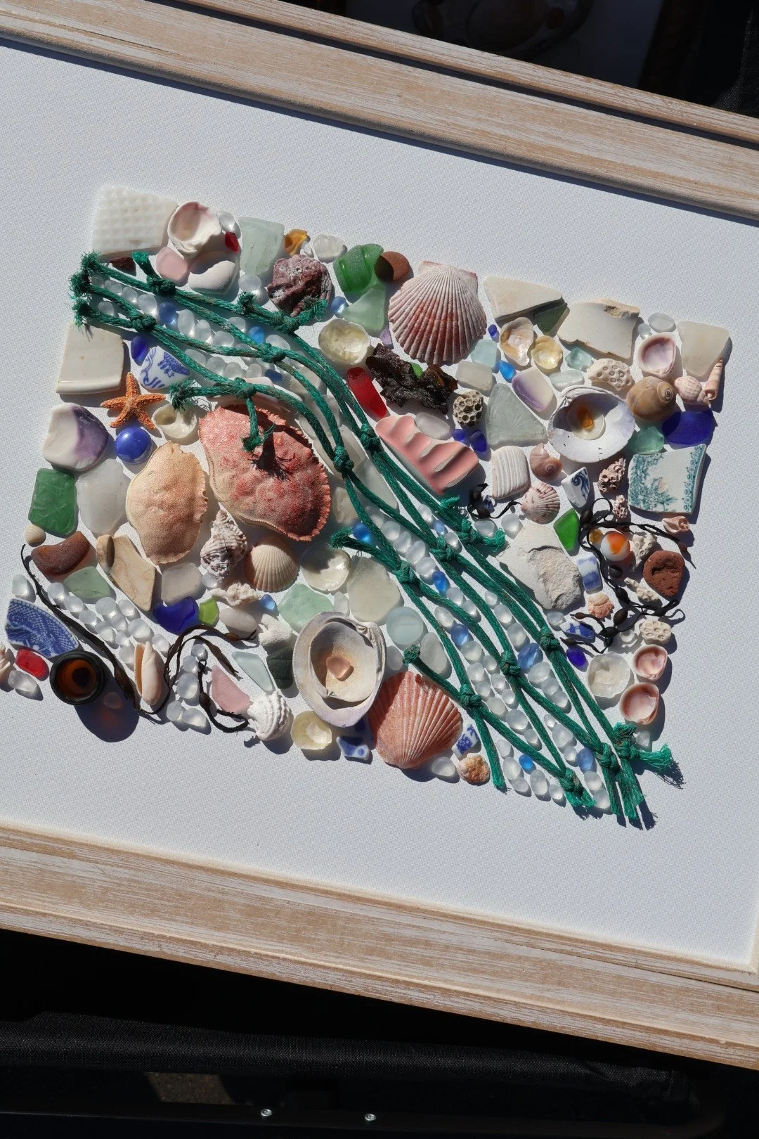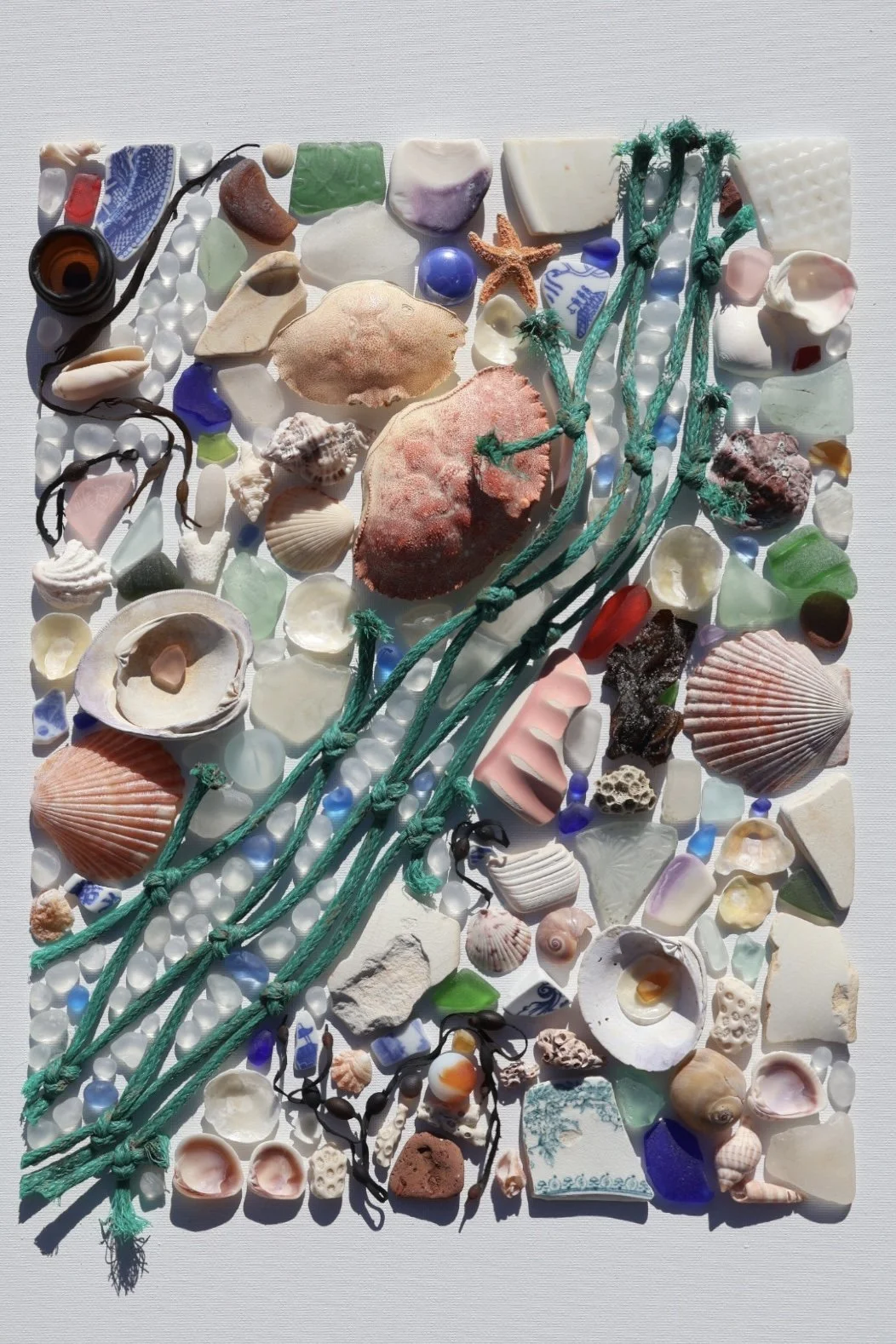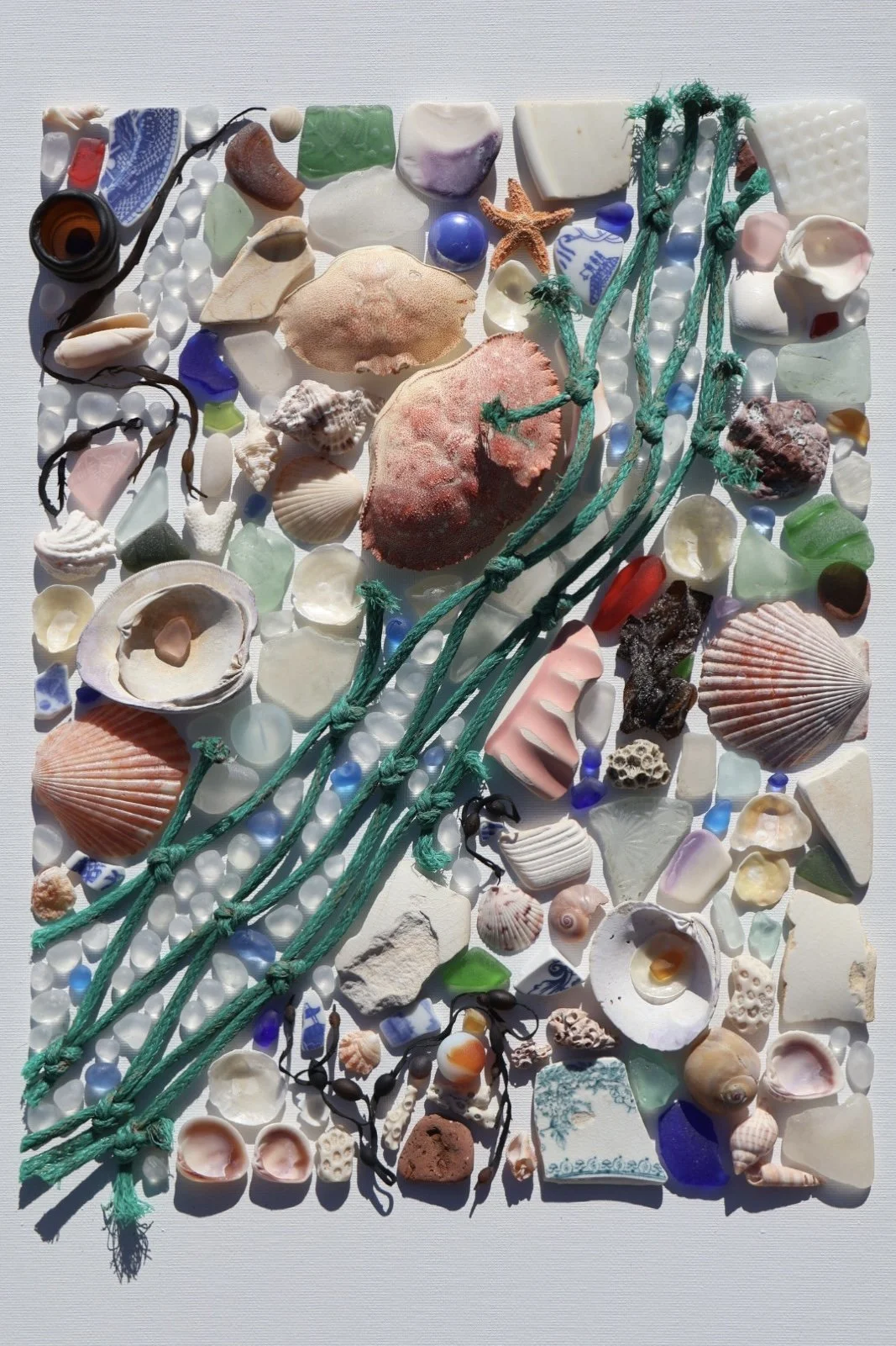 Medium: Mixed media coastal mosaic (sea glass, shells, pottery, driftwood, rope, and beach stones)