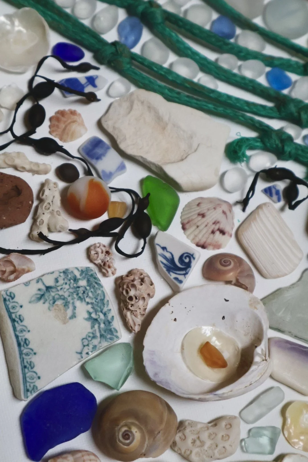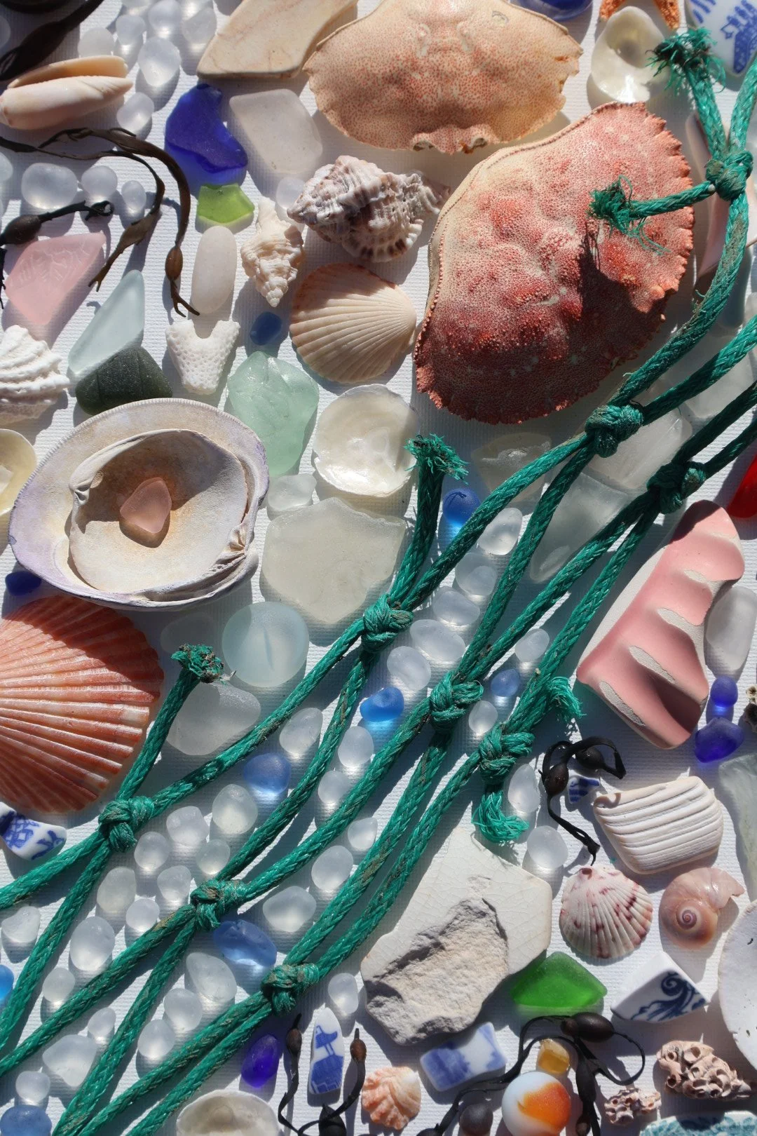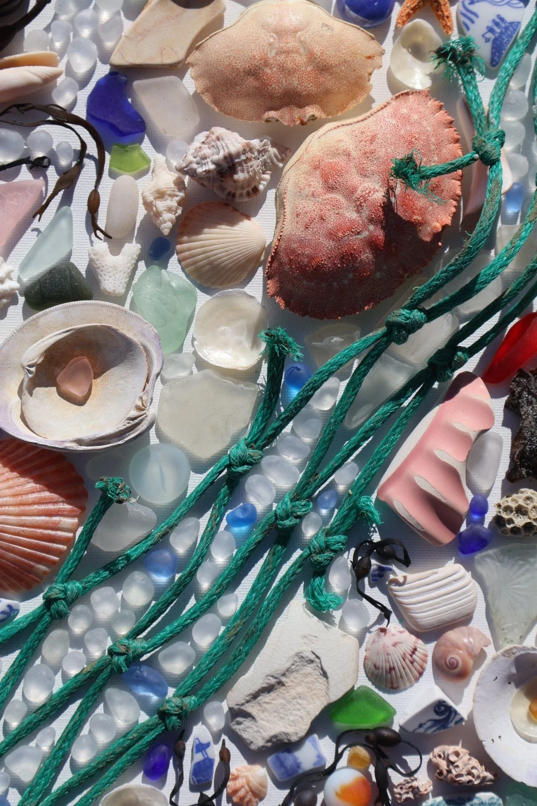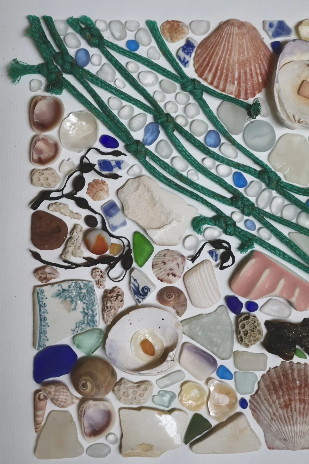 Medium: Mixed media coastal mosaic (sea glass, shells, pottery, driftwood, rope, and beach stones)